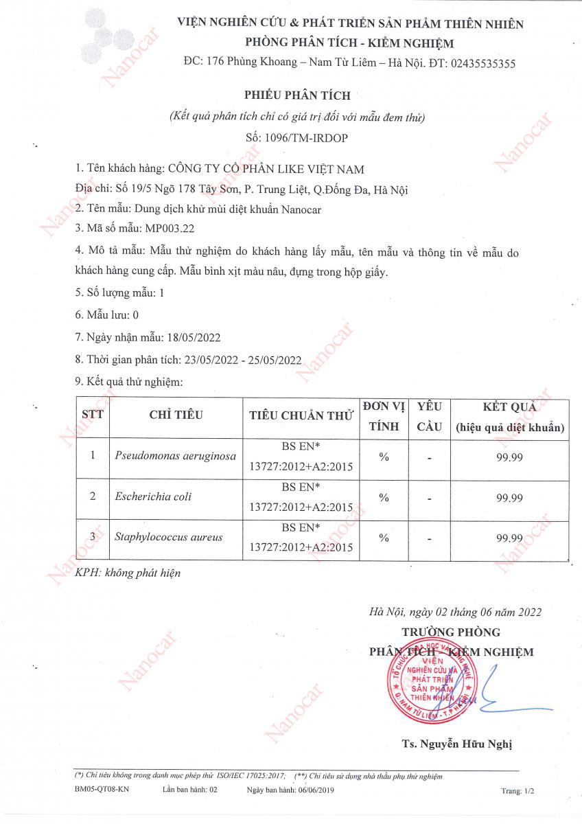 Sản phẩm Nanocar đạt chuẩn số 1095/TM-IRDOP của Viện nghiên cứu các sản phẩm thiên nhiên Việt Nam